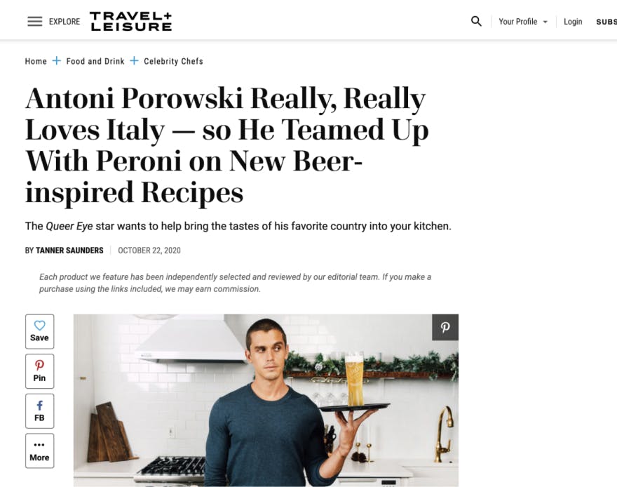 We brokered and managed a partnership with Queer Eye’s food and wine expert Antoni Porowski and Peroni to spread “Joy of the Aperitivo” amongst US audiences to bring greater awareness to the brand.