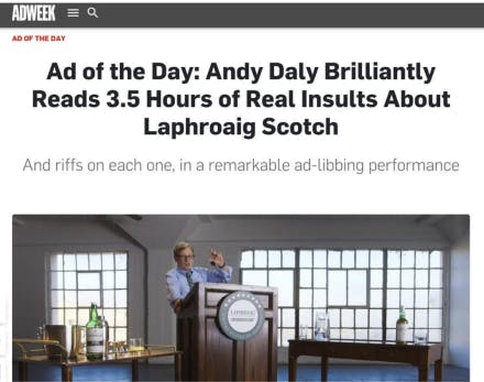 In what became the longest ever ad ever placed, we got one-of-a-kind Andy Daly to read hundreds of real consumer opinions – the good and the not so good – of Laphroaig for 3.5 hours, all scripted and filmed as a mock filibuster. Some truly moving, truly buzzworthy content.
